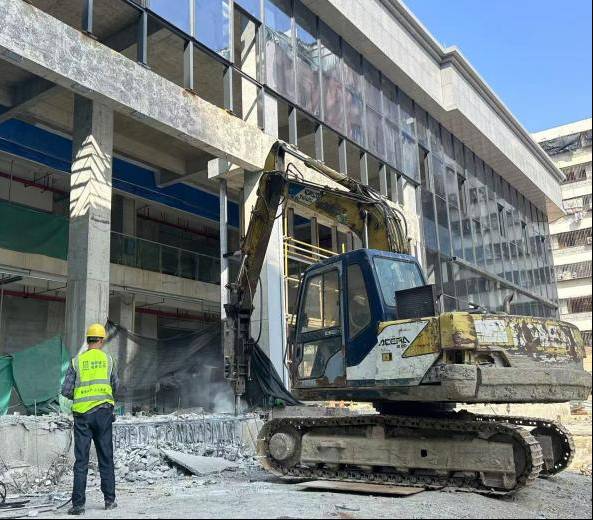 在“金葉匯”商業(yè)綜合體項(xiàng)目現(xiàn)場(chǎng),玻璃幕墻安裝已封頂,工人正在對(duì)塔吊承臺(tái)進(jìn)行破除,后續(xù)將做好公共區(qū)域裝飾裝修、機(jī)電安裝等收尾工作,沖刺全面竣工驗(yàn)收節(jié)點(diǎn)。